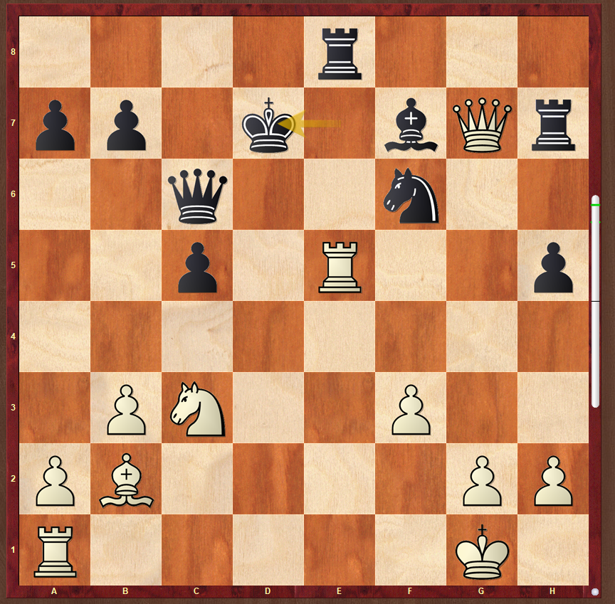 Jeg var selv hvid mod Jens Damgaard, og det lykkedes mig at ødelægge modstanderens kongestilling med Lxf7 tidligt i spillet. Herunder er der lige spillet 23. Txe5+, kd7. Den kloge computer siger at hvid er oppe med 8,01, hvis der spilles Dg5 og 7,02, hvis der spilles Td1+. Jeg spillede det sidste, men angrebet løb lige så langsomt ud i sandet. I den efterfølgende analyse var der ingen af de andre kloge klubmedlemmer, der kunne finde en nem vej til sejr. Langsomt smed jeg fordelen, og på et tidspunkt lignede det et ulige-farvet løberslutspil og remis. Heldigvis blev modstanderen overmodig og lavede et officeroffer for en fribonde, men der var ikke noget i det, og få træk efter måtte han give op.